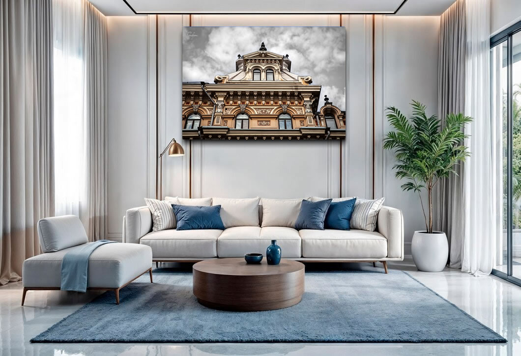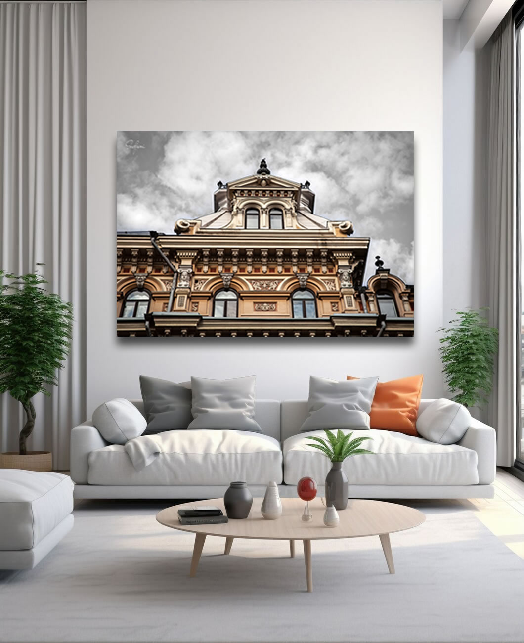 We rarely look up while we walk the streets of cities, missing out on some beautiful architecture. This beautiful building is in Helsinki. The ornate architecture looks beautiful against a blue sky. Presented here as an alternative against a dark sky.
